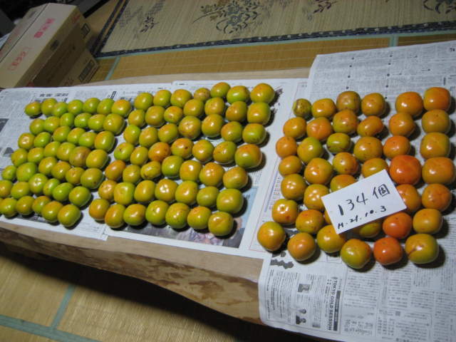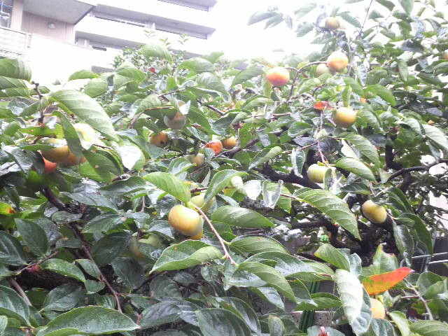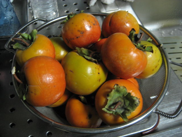 土曜日ですが、柿を収穫しました。 まだ少し青いですが、渋柿なので一週間ほど焼酎につけて「シブ」を抜きます。 今年は、量も大きさも平年以上です。 理由としては、4月に上を覆っていた「枝垂れ桜」を切ったからだと思います。 日当たりや風通しなど、環境がだいぶ良くなり、「イラガ」という毛虫も発生しませんでした。 ちなみに、この「柿の木」は樹齢100年以上で、この庭で一番の古木です。