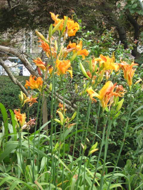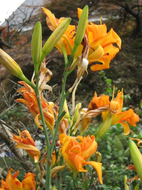 ユリ科の仲間ですが、花一つ一つは一日で萎れてしまいます。 遠くから眺めると鮮やかなオレンジでキレイですが、近くでよく見ると少し汚い感じがします。 「ワスレナグサ」とは無関係だそうです。 ヤブカンゾウ(藪萱草)ともいうそうです。
