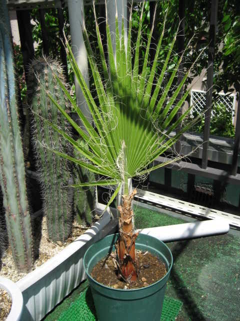「パームツリー」と呼ばれる、大型のヤシの木です。 定価¥2,450のはずが、何故か処分品コーナーで¥500とあったので迷わずGETしました。 冬の葉が無いときだったので、処分品に回されてしまったらしいです。 現在は、しっかりと新しい葉が出てきています。 シュロの木にそっくりですが、葉から白い糸がたくさん出ている所など違います。