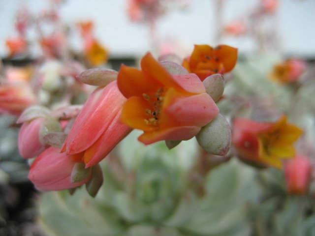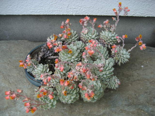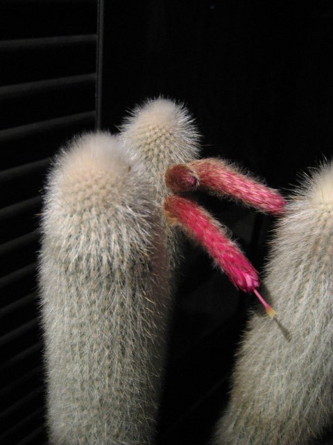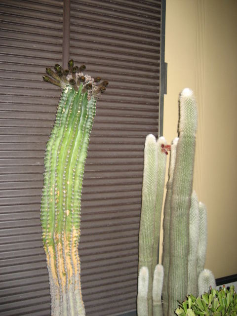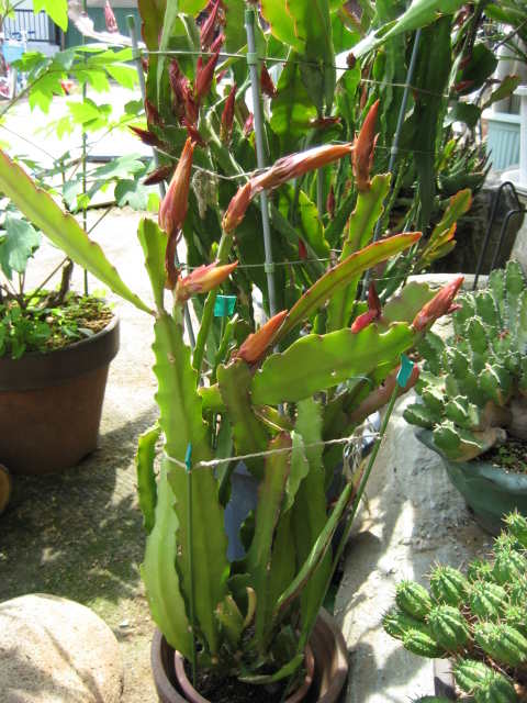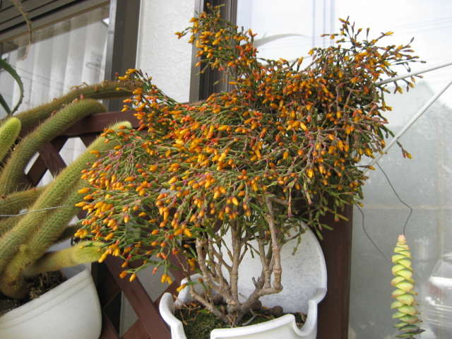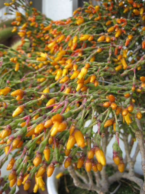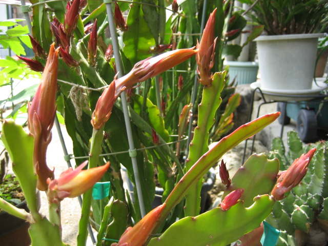 なんと、これもサボテンです。柱サボテンの仲間で「クジャクサボテン」に近い品種だそうです。 下の方を見ると、木の幹の枝のように育っています。 10年くらい前に、3節(5cm)くらいポキッと折って育てたものです。 花は、あまりよく開かないのですがすごい数です。