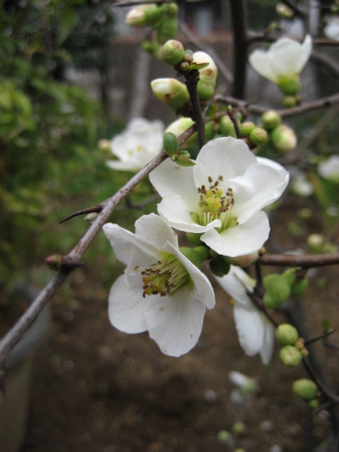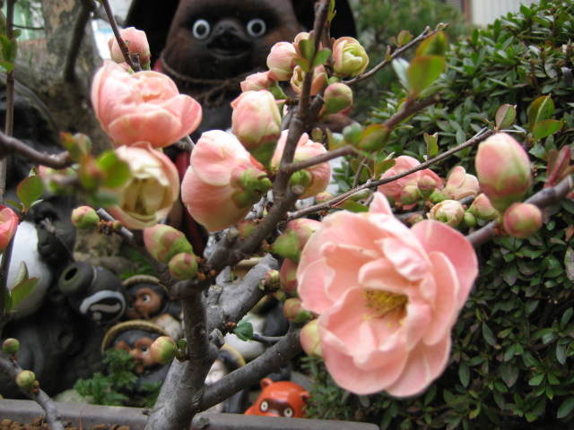 ボケは、枝に長いとげがあって少し危険です。 気をつけて剪定しないと、手が傷だらけになります。 花だけ見ると梅みたいです… こちらは、ピンク色のボケです。