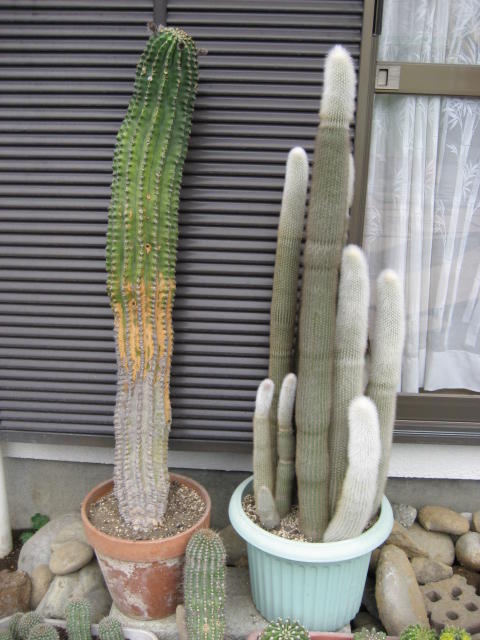 左は「短毛丸」で、推定で40年経っています。 玉サボテンのはずが、柱化しています。(110cm) 右は「白閃」で民芸品のおみやげ(10cmくらい)から育てたものです。 こちらは20年以上経っています。 基部から次々と子を出し、柱化します。 短毛丸のてっぺんに、季節はずれのつぼみが伸びてきました。