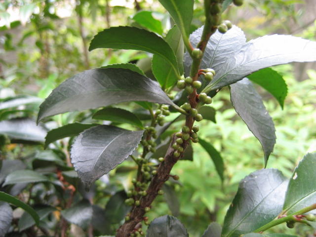 神棚などに飾られる木です。 毎月、3対(6束)買ってとりかえてますが、 今月は、自家製のサカキで済みました。 スーパーや生花店で買うと1対¥300くらいします。 ちなみに ↓ は姫榊の実で、これから黒色に熟していきます。
