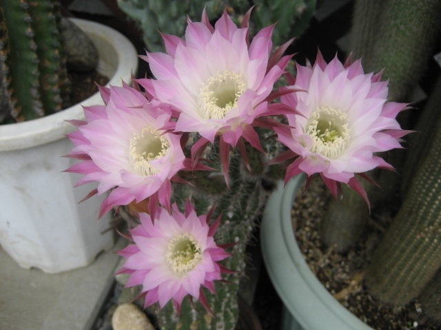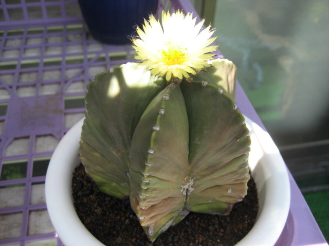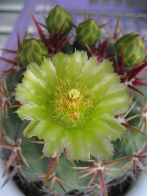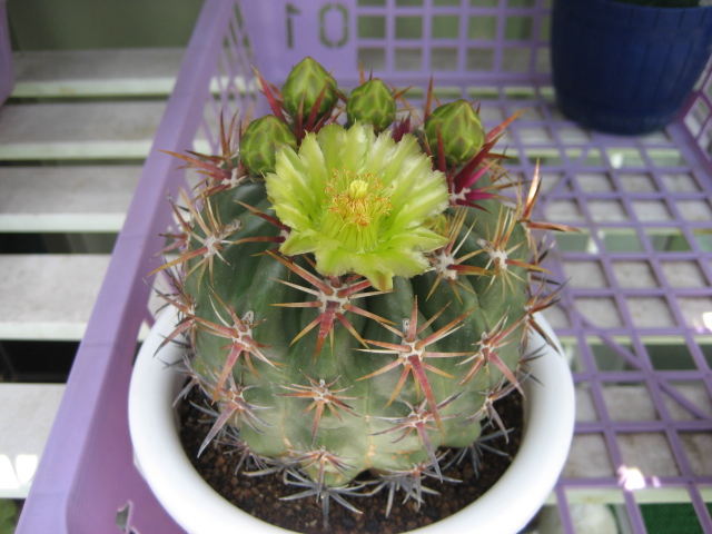 フェロカクタスだと思いましたが、詳しい名称はよく分かりません。 直径10cmくらいでまだ小ぶりですが、花が咲くようになりました。つぼみもたくさんついています。 サボテンや多肉植物は、今年に入ってから8割くらい処分しました。 花のきれいなものや、昔からあるものだけを残しました。置く場所を確保するのも結構気をつかいます。