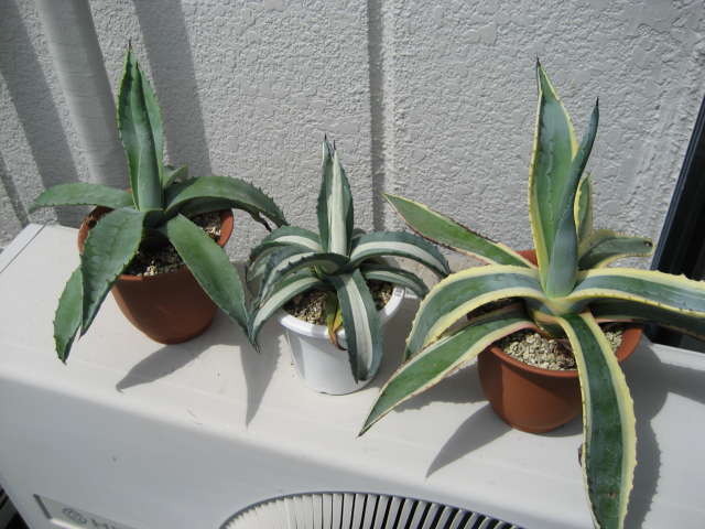 いずれも「アガベ・アメリカーナ」 この種は耐寒性が強く、日本でも海岸沿いに自生しているらしいです。 一年を通して、今が成長のピークです。