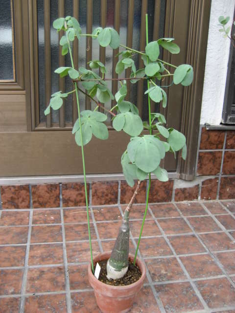 聞いた事のない名ですねー。 これは3年前、ドイトで¥250で買ったものです。 このホームセンターでは、このような珍植物がけっこう入手できます。 幹の直径は1.5cmくらいだったのが現在は4cmくらいまで膨らんでいます。 花は今の所、見てません(*^-^) ツル状の葉は冬に枯れ落ちますが、春から夏にかけてまた新たな新芽が伸びてきます。