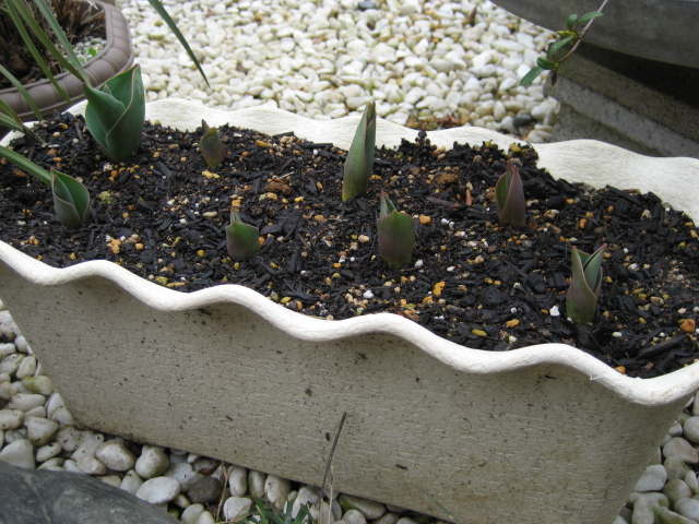 プランター植えのチューリップが芽を出しました。