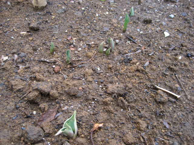 こちらは地植えのチューリップです。同じく芽を出しています。
