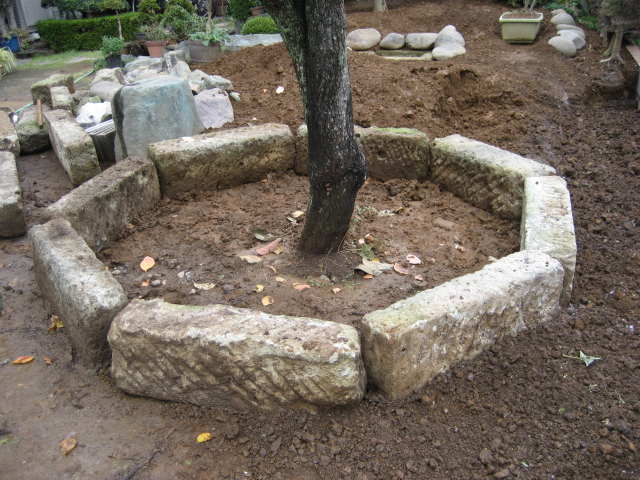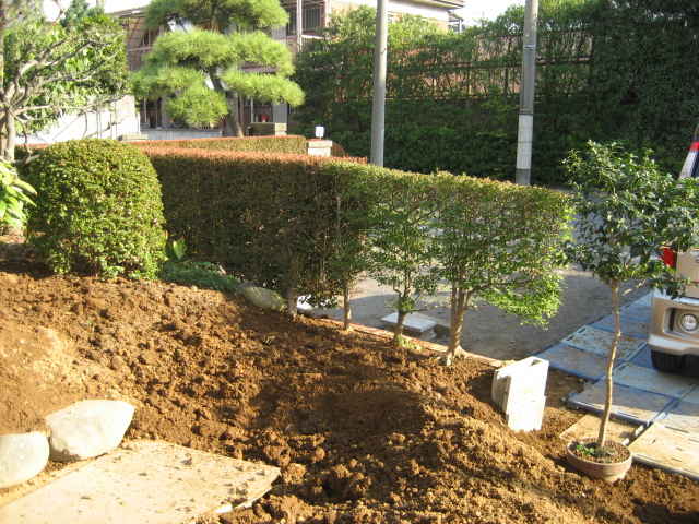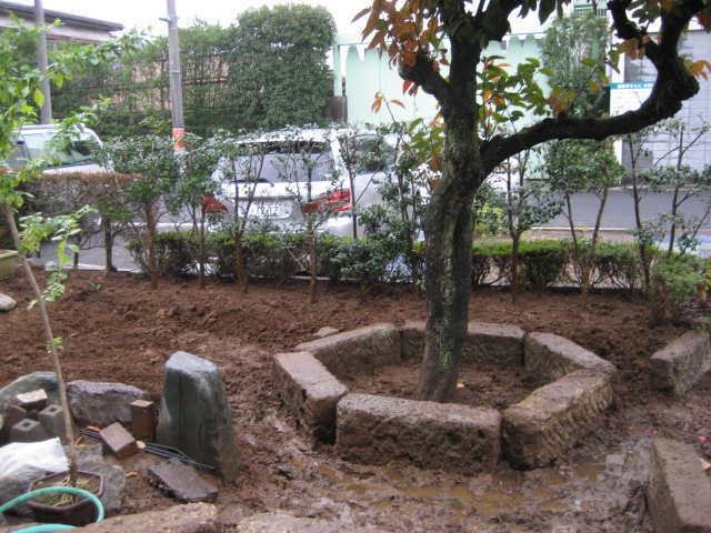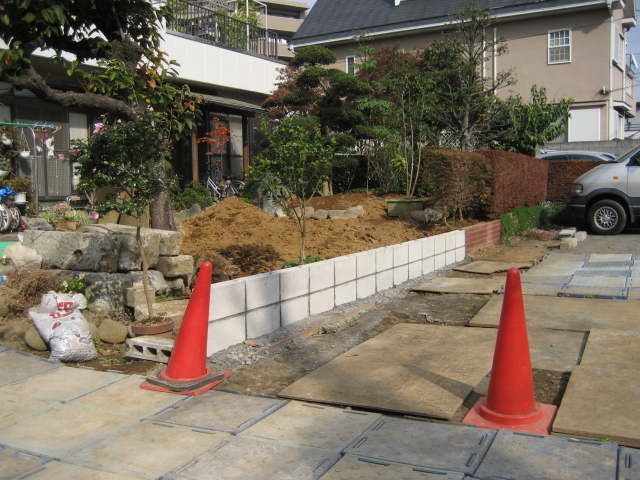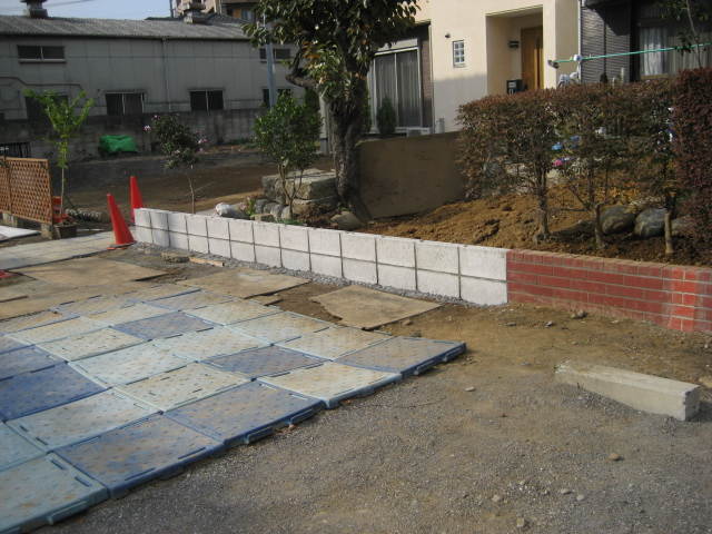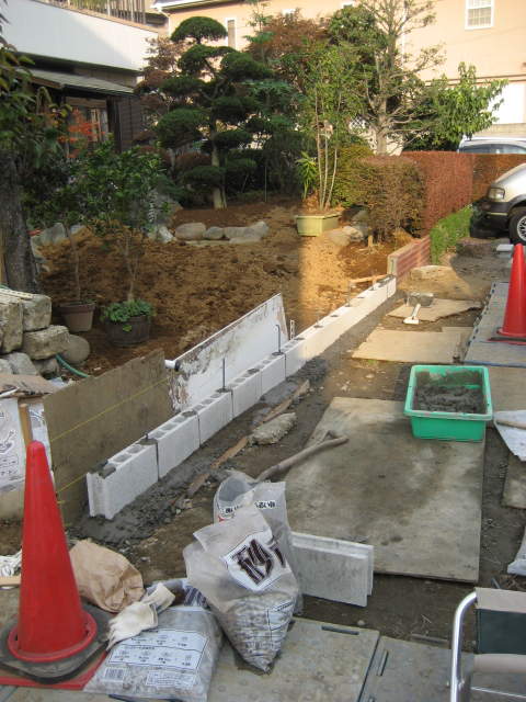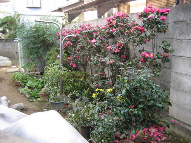 ブロック26個、セメント3袋、砂8袋、砂利7袋、鉄筋3本で、約¥9,000で収まりました。 レンガを続けて張るか、まだ未定です。そもそも同じレンガが売ってません。 こちらのサザンカ(12本)を生垣にする予定です。25年植わっていたのを、仮植えしていたものです。 何気に満開です。